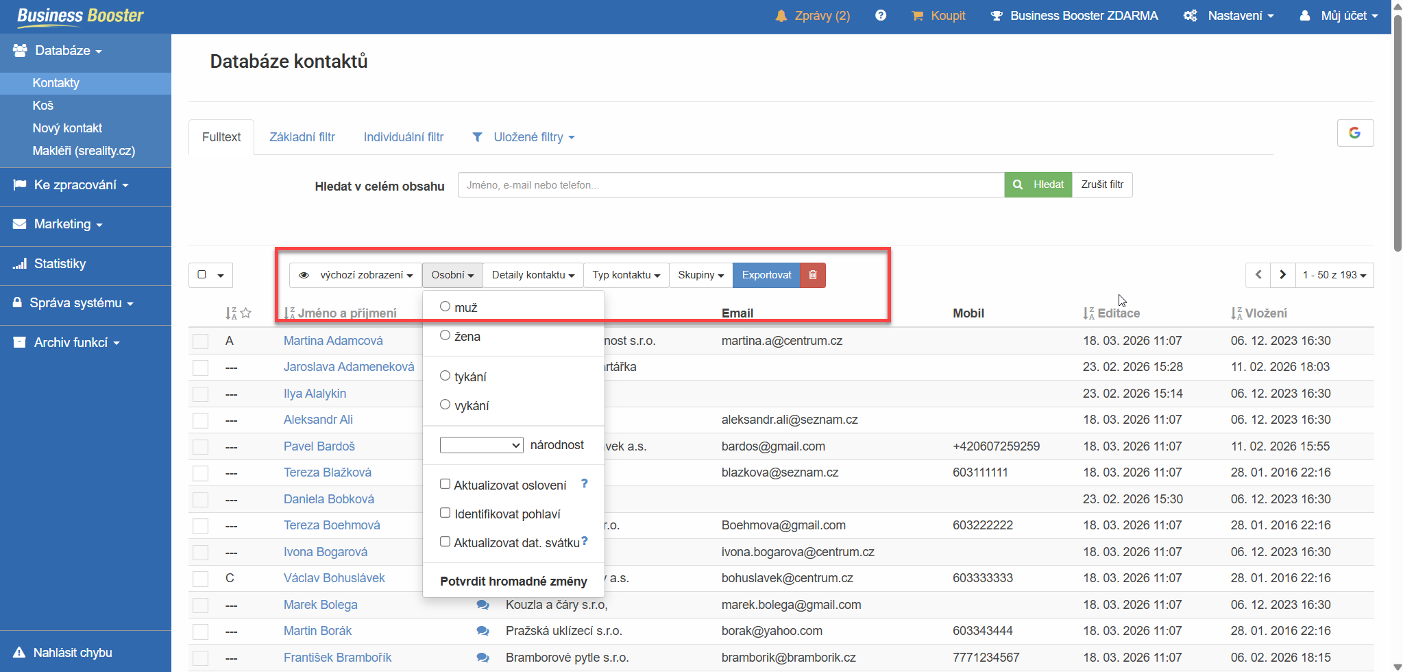 Business Booster: Panel pro hromadné úpravy kontaktů